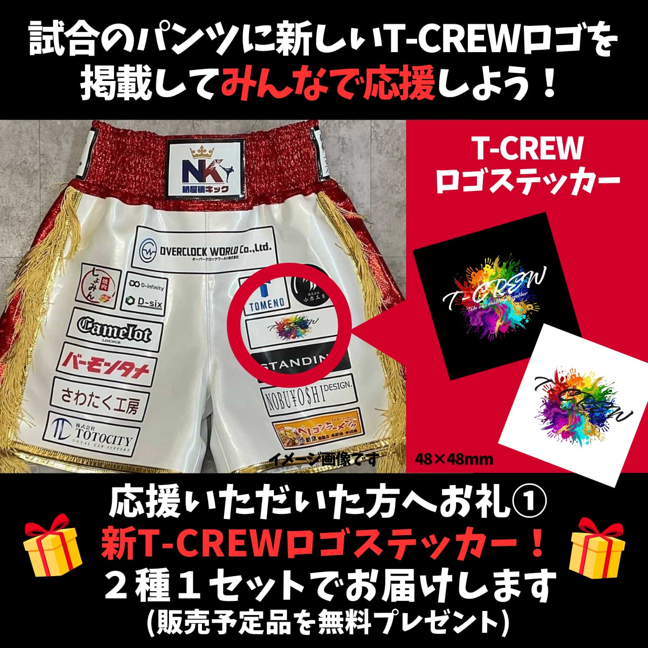 試合用パンツにも入っている新しいT-CREWロゴのステッカー(白&黒の2種)をリターンとして送付します。